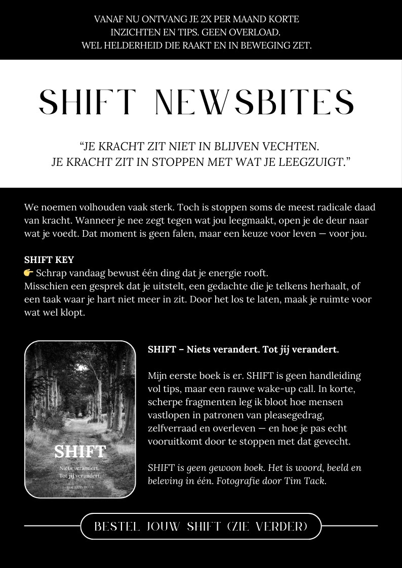 De cover staat vast. SHIFT wordt een wake-up boek, geen peptalk. Pre-order jouw exemplaar en ontvang je boek vanaf 20 oktober 2025.
